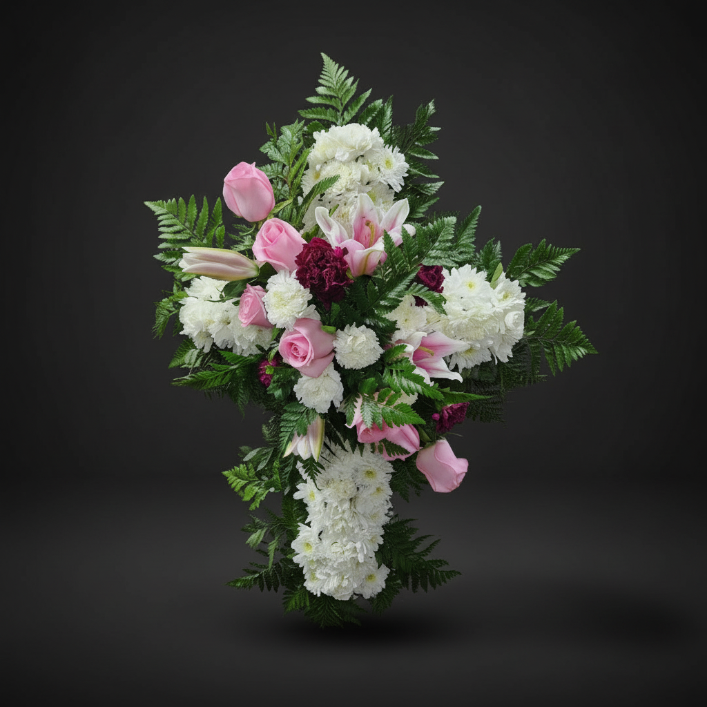 A delicate pink and white floral cross, beautifully arranged to honor a loved one and convey heartfelt sympathy.